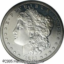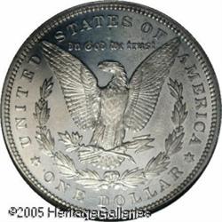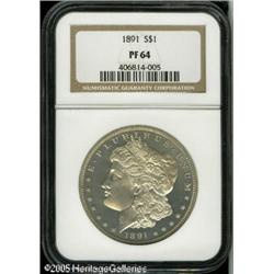 <B>1891<img border='0' src='http://www.heritagecoins.com/images/star.gif' width=10 height=10>$1 PR64 NGC.</B></I> Both sides exhibit an unusually sharp strike with no localized weakness over Liberty's ear or on the eagle's breast feathers. The obverse presents as brilliant with a hint of pale champagne color, the reverse exhibits a curious vertical streak of smoky-gray color over the right portion. One of only 650 proofs coined this year. Worth a close look by the perspective bidder. Lot:10660