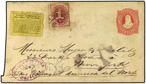 1891 Postal stationary envelope 8 c red cancelled on reverse by BUENOS AYRES datestamp addressed to NEW YORK, underpaid with oval NEW YORK POST OFFICE/DUE 1 CENT in violet bearing U.S. postage due 1 c claret (Scott J22) applied and tied on arrival with oval NEW YORK cancel with adjacent instructional LETTER RETURNED TO THE OFFICE BY CARRIER label and NOT FOUND on reverse. Unusual item.
