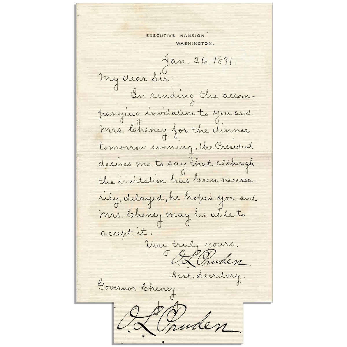 President Benjamin Harrison invitation to New Hampshire Governor Person Colby Cheney. Invitation, measuring 5.5'' x 4.5'' reads: ''The President and Mrs. Harrison request the pleasure of the company of Governor and Mrs. Cheney at dinner on Tuesday evening January 27 at 7 1/2 o'clock, 1891. To meet the Supreme Court.'' Also includes a 4.5'' x 7'' document signed on ''Executive Mansion'' stationery by the President's assistant secretary, dated 26 January 1891, with apologies for late delivery of invitation. With original envelopes. Near fine.