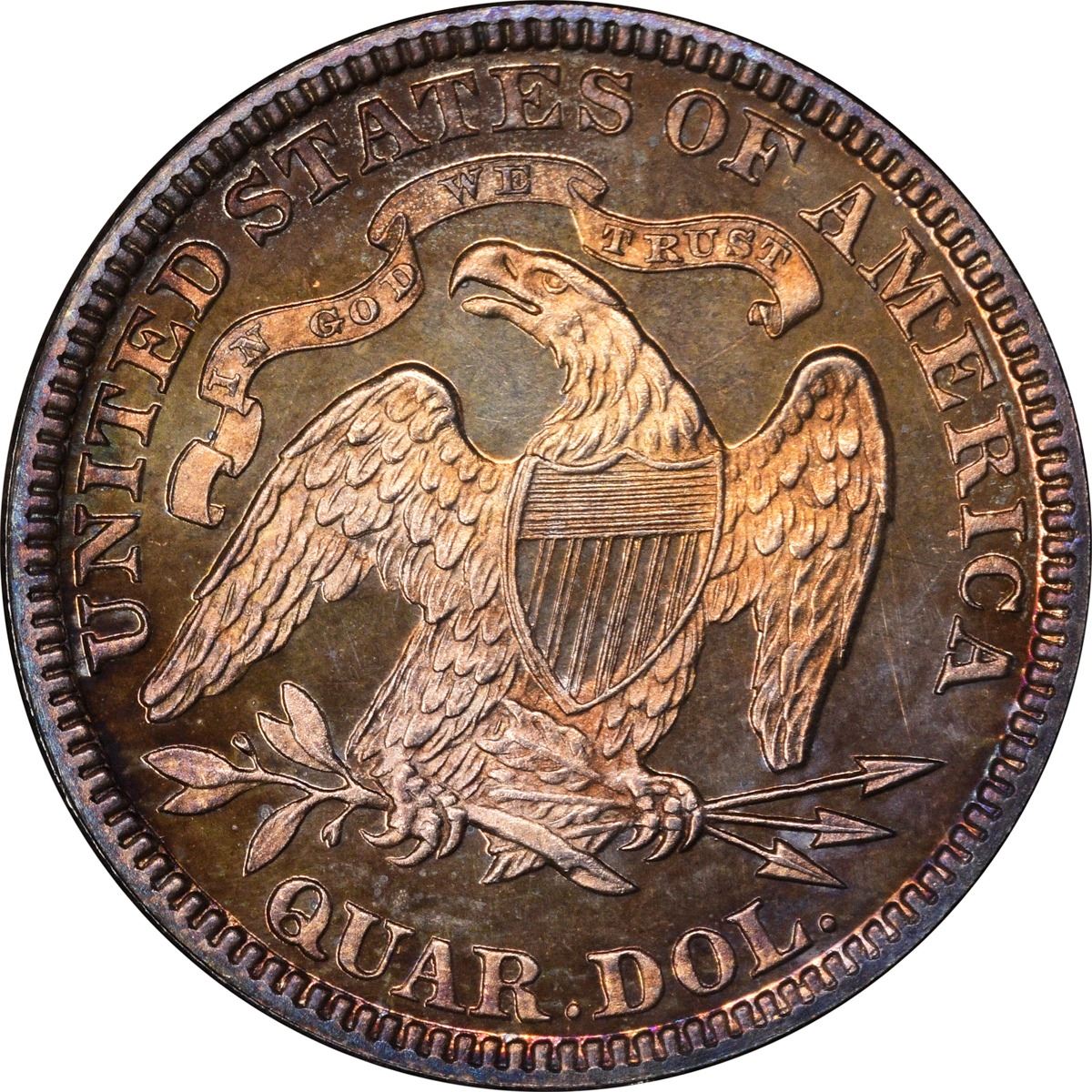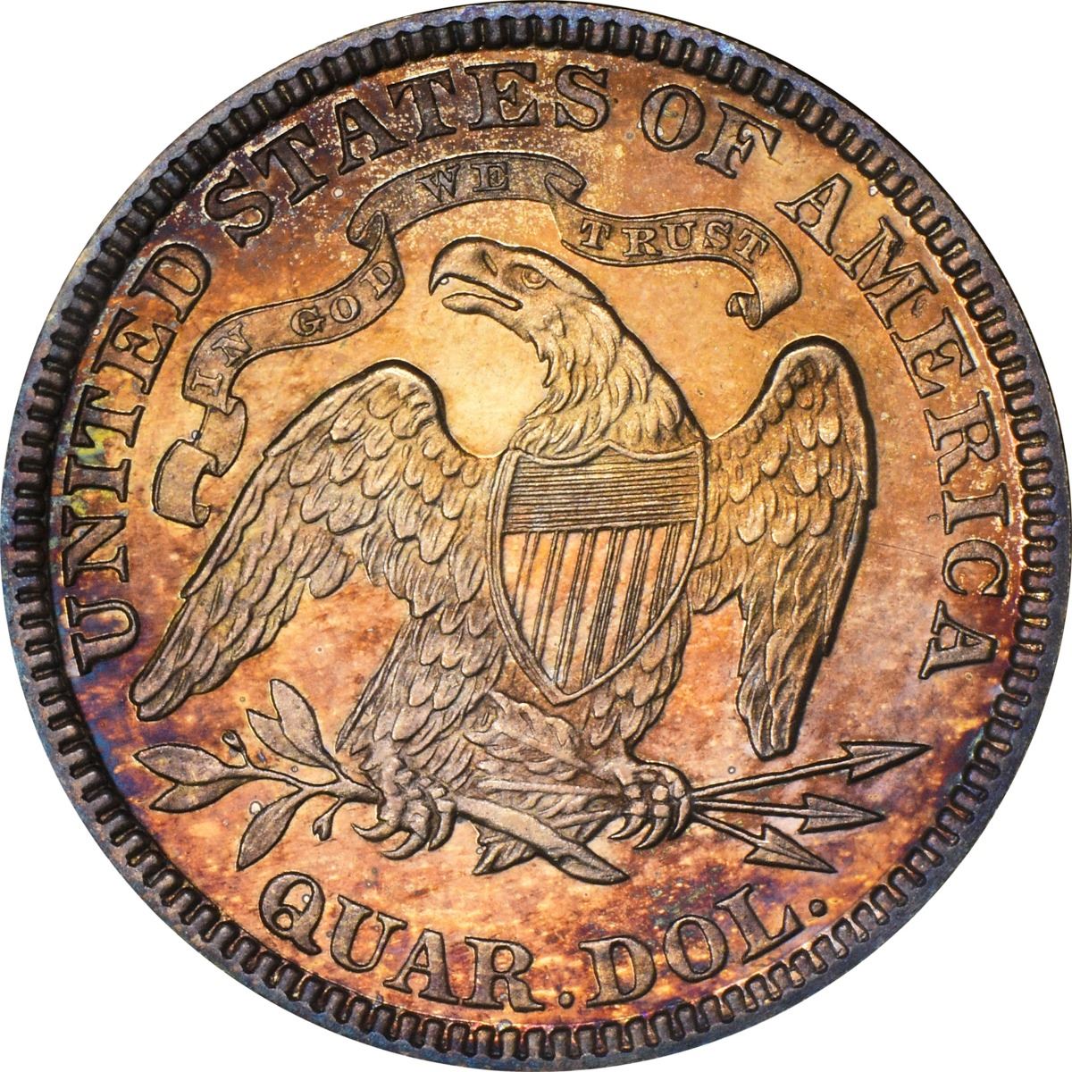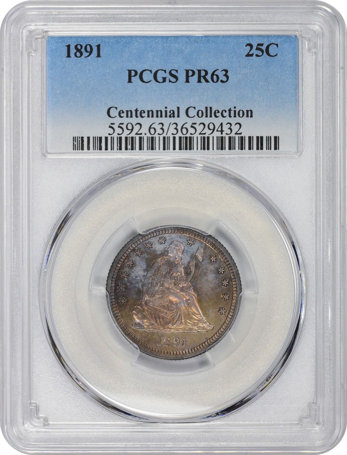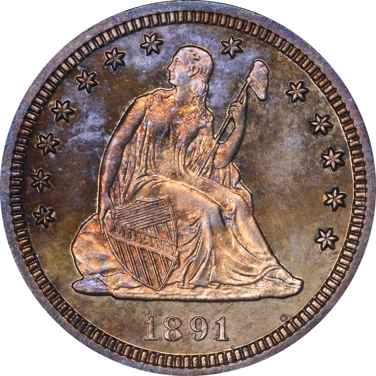 One of 600 Proofs produced during this terminal year of the design type. A bright blend of sky blue, crimson, and peach-gold catches the viewer’s eye on the obverse, while the reverse is a blend of vibrant peach-gold from stem to stern. One for the colorful coin aficionados among us. PCGS #5592