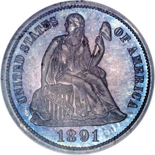 <B>1891 Proof Set PR65 Red to PR67 NGC.</B></I> <B>An 1891 Proof Set PR65 Red to PR67 NGC. </B></I>The set includes:<BR><B><BR>1891 1C Cent PR65 Red NGC.</B></I> The fiery-red surfaces reveal some cobalt-blue and lilac accents on this is sharply struck specimen. Highly reflective fields and well preserved on both sides. <BR><B><BR>1891 Nickel PR66 Cameo NGC. </B></I>Razor-sharp striking details are seen on silver-gray surfaces that show faint touches of apricot color on the obverse. Frosty-textured devices and mildly reflective fields produce noteworthy cameo contrast.<BR> <BR><B>1891 Dime PR67 NGC. </B></I>This is a crisply impressed Superb Gem whose reflective qualities are somewhat muted beneath deep electric-blue and rose toning. There are no contact marks or hairlines on either side.<BR><B><BR>1891 Quarter PR67 NGC. </B></I>A lovely specimen with gorgeous, deep violet-rose and cobalt-blue toning over the immaculately preserved surfaces. Fully struck.<BR><B><BR>1891 Half Dollar PR67 NGC. </B></I>The design elements are fully struck, and the surfaces are layered in beautiful electric-blue and rose coloration. There are one or two trivial contact marks, but they are too minor to limit the grade. <BR><B><BR>1891 Silver Dollar PR66 NGC.</B></I> Astoundingly deep purple-violet, electric-blue, and rose patina overlays both sides, yielding to lighter shades on the eagle's breast and wing feathers. There are no overtly distracting marks or hairlines, but a bit of striking weakness is evident on the hair strands just above Liberty's ear.<BR><BR><B>Coin Engraver:</B> George T. Morgan<BR><BR><b>Shipping:</b> Coins & Currency (<a target="_blank" href="http://www.heritageauctions.com/common/shipping.php">view shipping information</a>)