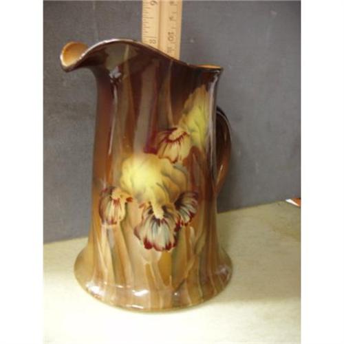 THIS GLOSS ROOKWOOD DÉCOR PITCHER MADE BY NIPPON AROUND 1891, HAS A BLUE MARK. IT IS 6 INCHES IN DIAMITER AND 8 1/8 INCHES HIGH. THERE ARE THREE MINOR CHIPS (ILISTRATED) IS THE LARGEST,THE SIZE OF A PIN HEAD. I WAS UNABLE TO FIND THIS BODY STYLE IN JOAN F. VAN PATTEN?S BOOKS, THERE WERE PHOTOS OF THE GRAPHIC STYLE, ON PAGE 220 OF BOOK 4 AND PAGE 91 OF BOOK 6, ALSO PAGE 200 OF BOOK 6.THIS PITCHER IS ATRIST SIGNED BY MK AND HAS SEVERAL MINOR SCRATCHES, OVER ALL IT IS IN GOOD CONDITION. HAVE FUN BIDING AND REMEMBER TO ASK QUESTIONS BEFORE YOU BUY. THANKS