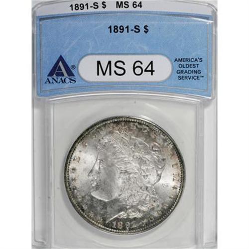 <B>1891-S $1 MS64 ANACS.</B></I> NGC Census: (1105/202). PCGS Population (1506/393). Mintage: 5,296,000. Numismedia Wsl. Price for NGC/PCGS coin in MS64: $224. (#7210)<BR><BR><B>Coin Engraver:</B> George T. Morgan<BR><BR><b>Shipping:</b> Coins & Currency (<a target="_blank" href="http://www.heritageauctions.com/common/shipping.php">view shipping information</a>)