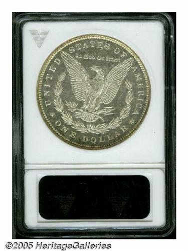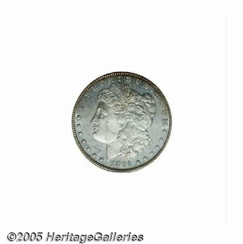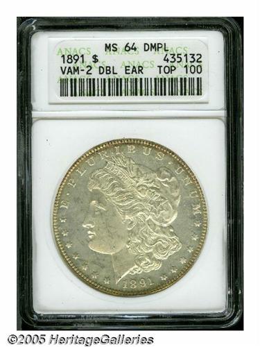 <B>1891<S$1> MS64 Deep Mirror Prooflike ANACS.</B></I> VAM-2. Top 100 Variety. The obverse has dusky apricot patina, while the reverse has gold color across the rims. The strike is not full in the centers, but the details of Liberty's doubled earlobe are readily apparent. While the 1891 can be found without much difficulty in Mint State, examples with deeply mirrored fields are decidedly rare.