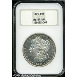 1891 S$1 MS64 Deep Mirror Prooflike NGC. The 1891 <B>1891 S$1 MS64 Deep Mirror Prooflike NGC.</B></I> The 1891 Morgan is surprisingly elusive with deeply reflective mirrors such as seen on this coin, and those surviving at the Choice level are legitimately rare. Offered here is mostly brilliant example with heavily frosted devices that provide good field-to-device contrast. Grade limiting blemishes are primarily limited to the cheek area on Liberty's portrait and the left obverse field. <BR><BR><B>Important notice:</B> Heritage usually auctions material at the rate of 200-250 lots per hour. On some occasions eBay Live bid software or the Internet may not be able to keep up with the pace of the auction. We recommend placing a realistic absentee bid now as insurance to avoid disappointment. Occasionally the auctioneer may eliminate or reject an eBay Live bid, and the auctioneer may also reopen a lot after the close of the eBay live bidding (usually because we missed an audience bid), and may reject your bid even if it shows you as the winning bidder. By bidding via eBay Live, you agree that Heritage may award the lot to another bidder at its sole discretion under the circumstances described above or any other reasonable circumstances. Since eBay bids are not shown to us until we open the lot on the floor, we treat those bids just like floor bids. In most cases the floor responds before the eBay bid is presented to us, due to Internet lag time, so for consistency we have made it a policy that floor bids are always considered first over tie eBay live bids. Also please note that all Heritage lots purchased through eBay Live carry a 20% Buyer's Premium. Please make sure you read the Terms and Conditions before you bid. This lot is being auctioned in conjunction with a live floor auction by Heritage Galleries & Auctioneers. All final auction and invoice information will be supplied by Heritage Galleries & Auctioneers, and all other information should be considered preliminary. Lot:7604