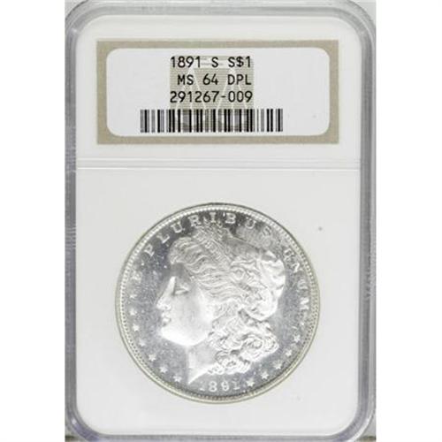 <B>1891-S $1 MS64 Deep Mirror Prooflike NGC.</B></I> Well struck with intense reflectivity in the fields and an effulgent, dazzling sheen across both sides. Trace amounts of milky patina are located mainly near the peripheries; otherwise the piece is untoned. A small scrape in the left reverse field prevents the Gem assessment, but does little to inhibit the visual splendor of this deeply prooflike example. Census: 37 in 64 Deep Mirror Prooflike, 5 finer (5/07). <BR><I>From The Vanek Collection.</B></I><BR><BR><b>Shipping:</b> Coins & Currency (<a target="_blank" href="http://www.heritageauctions.com/common/shipping.php">view shipping information</a>)