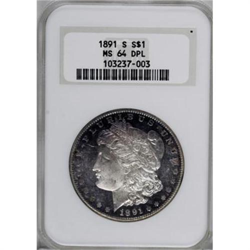<B>1891-S $1 MS64 Deep Mirror Prooflike NGC.</B></I> Cherry-red and sea-green grace the peripheries of this assertively struck and moderately frosted silver dollar. Certified in a former generation holder. A rare issue with prominently mirrored fields. Census: 38 in 64 Deep Mirror Prooflike, 5 finer (9/07).<BR><I>Ex: Midwinter ANA Signature (Heritage, 3/97), lot 489.</B></I><BR><BR><b>Shipping:</b> Coins & Currency (<a target="_blank" href="http://www.heritageauctions.com/common/shipping.php">view shipping information</a>)