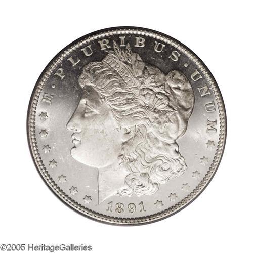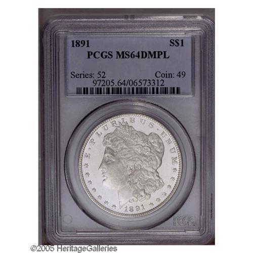 <B>1891<S$1> MS64 Deep Mirror Prooflike PCGS.</B></I> VAM-2. The 1891 is a rarely encountered issue with deeply reflective mirrors such as these. The fields are bright and deeply mirrored, and each side is mostly brilliant with just a hint of light golden present around the peripheries. Well struck, each side shows only the slightest abrasions that prevent consideration at an even higher grade level. Population: 16 in 64, 0 finer (10/05).
