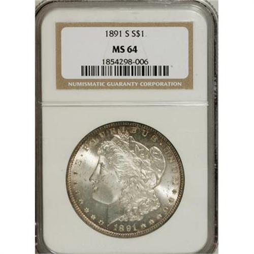 <B>1891-S $1 MS64 NGC.</B></I> NGC Census: (1104/201). PCGS Population (1495/393). Mintage: 5,296,000. Numismedia Wsl. Price for NGC/PCGS coin in MS64: $224. (#7210)<BR><BR><B>Coin Engraver:</B> George T. Morgan<BR><BR><b>Shipping:</b> Coins & Currency (<a target="_blank" href="http://www.heritageauctions.com/common/shipping.php">view shipping information</a>)