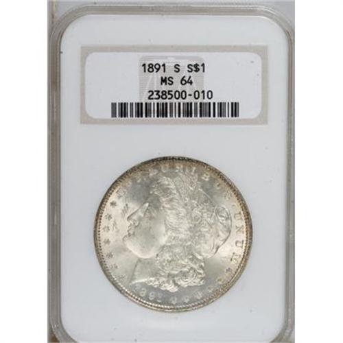 <B>1891-S $1 MS64 NGC.</B></I> NGC Census: (1111/202). PCGS Population (1546/398). Mintage: 5,296,000. Numismedia Wsl. Price for NGC/PCGS coin in MS64: $224. (#7210)<BR><BR><B>Coin Engraver:</B> George T. Morgan<BR><BR><b>Shipping:</b> Coins & Currency (<a target="_blank" href="http://www.heritageauctions.com/common/shipping.php">view shipping information</a>)