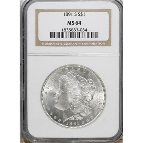 <B>1891-S $1 MS64 NGC.</B></I> . NGC Census: (1132/207). PCGS Population (1571/401). Mintage: 5,296,000. Numismedia Wsl. Price for NGC/PCGS coin in MS64: $240. (#7210)<BR><BR><B>Coin Engraver:</B> George T. Morgan<BR><BR><b>Shipping:</b> Coins & Currency (<a target="_blank" href="http://www.heritageauctions.com/common/shipping.php">view shipping information</a>)