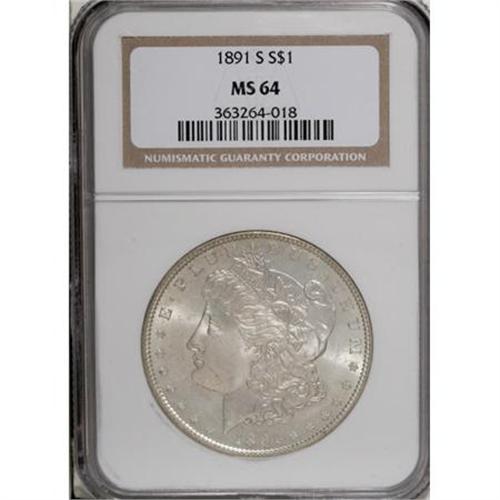 <B>1891-S $1 MS64 NGC.</B></I> . NGC Census: (1130/207). PCGS Population (1571/401). Mintage: 5,296,000. Numismedia Wsl. Price for NGC/PCGS coin in MS64: $240. (#7210)<BR><BR><B>Coin Engraver:</B> George T. Morgan<BR><BR><b>Shipping:</b> Coins & Currency (<a target="_blank" href="http://www.heritageauctions.com/common/shipping.php">view shipping information</a>)