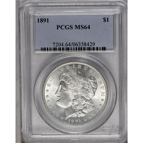 1891 S$1 MS64 PCGS. A bright, satiny near-Gem with sha 1891