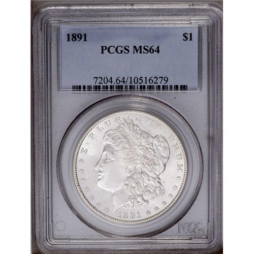 <B>1891<img border='0' src='http://www.heritagecoins.com/images/star.gif' width=10 height=10>$1> MS64 PCGS.</B></I> A well struck and untoned example with lovely luster. The fields are remarkably clean, though slide marks on Liberty's jaw account for the grade.