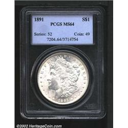 1891 S$1 MS64 PCGS. Pure white with a near-perfect strike and a couple of small marks on Liberty's face that prevent a higher grade. Pleasing in appearance and a true near-gem. Important notice: We expect to be auctioning lots at the rate of 200-250 per hour. Sometimes eBay Premier live bid software cannot keep up with that pace, so we strongly recommend that you place a realistic proxy bid now as insurance to avoid disappointment. Also please note that all Heritage/CAA lots purchased through eBay Premier carry a 20% Buyer's Premium.