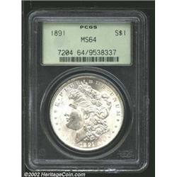 1891 S$1 MS64 PCGS. Satiny and untoned with decent sharpness throughout and only a few stray facial blemishes. Important notice: We expect to be auctioning lots at the rate of 200-250 per hour. Sometimes eBay Premier live bid software cannot keep up with that pace, so we strongly recommend that you place a realistic proxy bid now as insurance to avoid disappointment. Also please note that all Heritage/CAA lots purchased through eBay Premier carry a 20% Buyer's Premium.