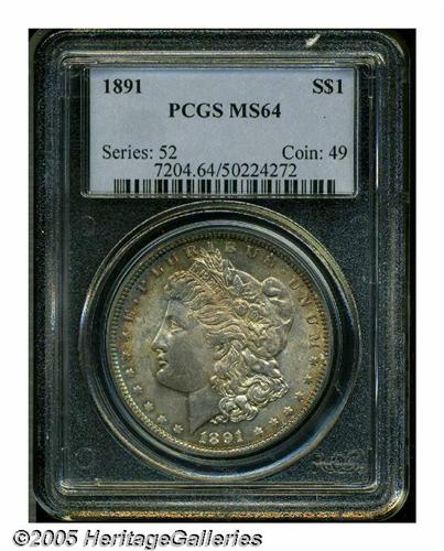 <B>1891<S$1> MS64 PCGS.</B></I> Sharply defined on both obverse and reverse, the surfaces display lovely, original gray-golden patina that deepens to cobalt-blue around the peripheries.