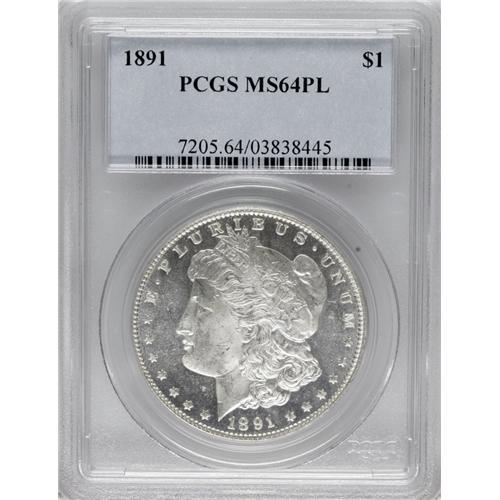 <B>1891 S$1 MS64 Prooflike PCGS.</B></I> David Bowers writes of the 1891 dollar that: "Partially and fully prooflike coins exist, but usually have low contrast in relation to the design features, and accordingly, the demand for them is not great." Reflective fields on the near-Gem in this lot do indeed offer contrast with the design elements, which is brought out even more by their sharp definition, and by the lack of toning on the surfaces. Minute obverse marks limit the grade. Population: 16 in 64 Prooflike, 0 finer (3/07).<BR><BR><b>Shipping:</b> Coins & Currency (<a target="_blank" href="http://www.heritageauctions.com/common/shipping.php">view shipping information</a>)