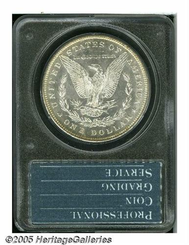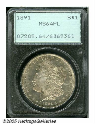 <B>1891<S$1> MS64 Prooflike PCGS.</B></I> Well struck with a bright, frosty, untoned reverse and an attractively toned champagne-tan obverse. Both sides reveal glittering, flashy luster, and carefully preserved, slightly abraded surfaces. Safely confined to a first-generation PCGS holder. Population: 13 in 64 Prooflike, 0 finer with the same finish (4/05).
