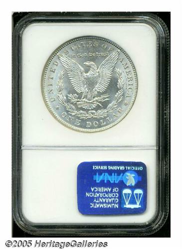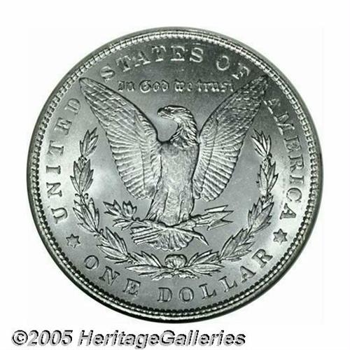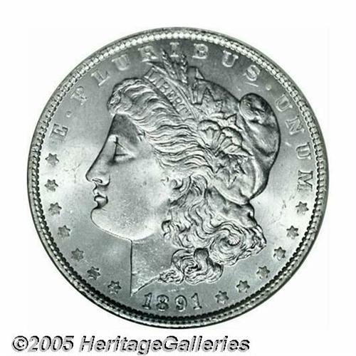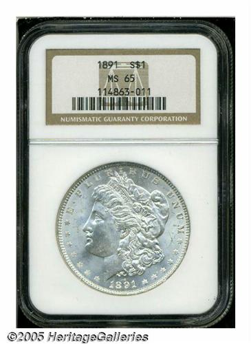 <B>1891<S$1> MS65 NGC.</B></I> The 1891 is a surprising sleeper in the Morgan Dollar series, with very few examples that have achieved this lofty grade by either of the major services. This piece shows satiny mint luster and is sharply struck with minimal abrasions. Population: 58 in 65, 3 finer (4/05).