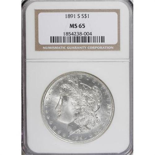 <B>1891-S $1 MS65 NGC.</B></I> A flashy '91-S dollar that was struck from heavily basined dies, resulting in concave fields that are bright and nearly Prooflike. Brilliant and fully struck.<BR><BR><b>Shipping:</b> Coins & Currency (<a target="_blank" href="http://www.heritageauctions.com/common/shipping.php">view shipping information</a>)