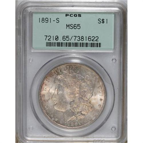 <B>1891-S $1 MS65 PCGS.</B></I> Orange-gold toning dominates both sides, and is slightly deeper on the obverse. Lustrous and crisply struck with a smooth cheek. A pleasing late 19th century S-mint Morgan dollar, encapsulated in an old green label holder.<BR><BR><B>Coin Engraver:</B> George T. Morgan<BR><BR><b>Shipping:</b> Coins & Currency (<a target="_blank" href="http://www.heritageauctions.com/common/shipping.php">view shipping information</a>)