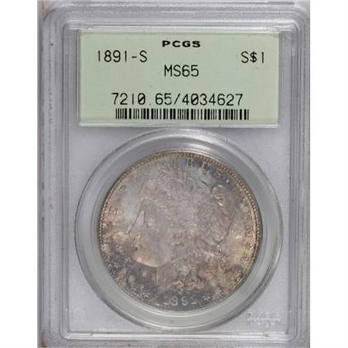 <B>1891-S $1 MS65 PCGS.</B></I> Splashes of golden-brown, ice-blue, and salmon-pink dominate this shimmering and meticulously struck Gem. Rare any finer, and encapsulated in an old green label holder.<BR><BR><B>Coin Engraver:</B> George T. Morgan<BR><BR><b>Shipping:</b> Coins & Currency (<a target="_blank" href="http://www.heritageauctions.com/common/shipping.php">view shipping information</a>)