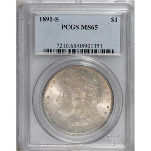 <B>1891-S $1 MS65 PCGS.</B></I> Dusky orange-gray toning drapes this lustrous and precisely struck Gem. The fields are unusually smooth, and even the cheek is undisturbed.<BR><BR><B>Coin Engraver:</B> George T. Morgan<BR><BR><b>Shipping:</b> Coins & Currency (<a target="_blank" href="http://www.heritageauctions.com/common/shipping.php">view shipping information</a>)
