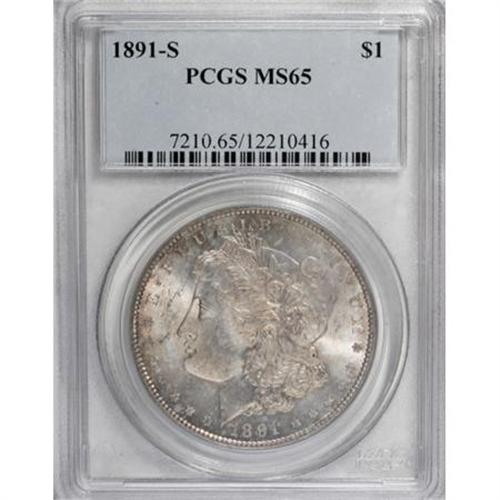 <B>1891-S $1 MS65 PCGS.</B></I> Orange-gold toning dominates both sides, and is slightly deeper on the obverse. Lustrous and crisply struck with a smooth cheek. A pleasing late 19th century S-mint Morgan dollar, encapsulated in an old green label holder.<BR><BR><B>Coin Engraver:</B> George T. Morgan<BR><BR><b>Shipping:</b> Coins & Currency (<a target="_blank" href="http://www.heritageauctions.com/common/shipping.php">view shipping information</a>)