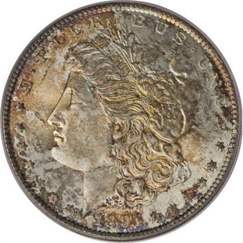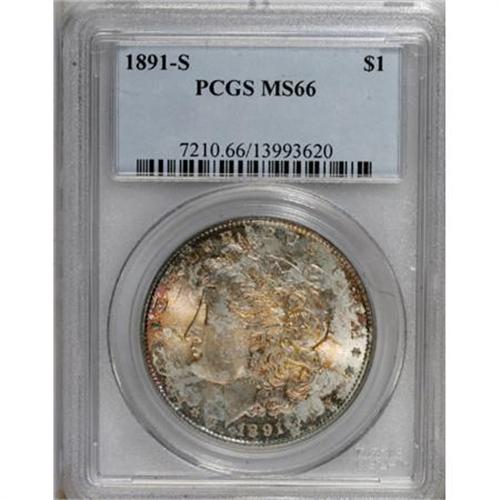 <B>1891-S $1 MS66 PCGS.</B></I> Beautiful golden-brown and stone-gray alternate across the obverse. The reverse colors are similar, but the toning is primarily peripheral. This well struck Premium Gem is exemplary aside from a thin mark near the U in UNITED. Population: 47 in 66, 7 finer (8/07).<BR><BR><B>Coin Engraver:</B> George T. Morgan<BR><BR><b>Shipping:</b> Coins & Currency (<a target="_blank" href="http://www.heritageauctions.com/common/shipping.php">view shipping information</a>)