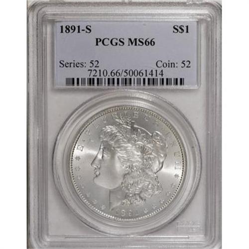 <B>1891-S $1 MS66 PCGS.</B></I> The brilliant surfaces of this remarkable Gem are resplendent with shimmering coruscant luster that flashes from each side with dazzling cartwheel splendor. Essentially defect-free, this is an exceptional example of this scarcer S-mint in the always popular Morgan dollar series. Population: 48 in 66, 7 finer (12/07).<BR><I>From The Jimmy G. PCGS Registry Collection of Morgan Dollars with Varieties.</B></I><BR><BR><B>Coin Engraver:</B> George T. Morgan<BR><BR><b>Shipping:</b> Coins & Currency (<a target="_blank" href="http://www.heritageauctions.com/common/shipping.php">view shipping information</a>)