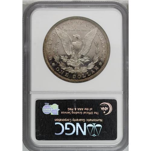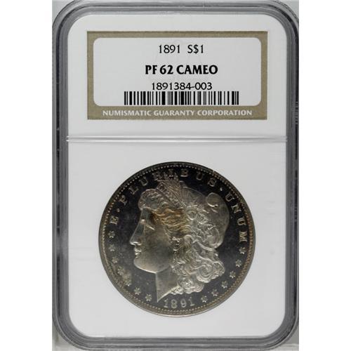 <B>1891<img border='0' src='http://www.heritagecoins.com/images/star.gif' width=10 height=10>$1> PR62 Cameo NGC.</B></I> Attractively toned cameo with dark-violet watery fields and frosted devices, which, on the obverse, show a streak of sunset orange. A number of wispy abrasions and a few tiny reeding marks in the fields account for the grade.