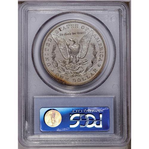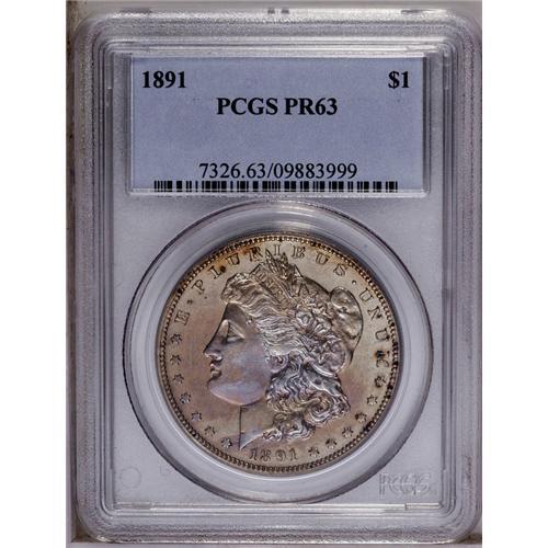 <B>1891<img border='0' src='http://www.heritagecoins.com/images/star.gif' width=10 height=10>$1> PR63 PCGS.</B></I> Pastel steel-blue and apricot hues embrace the obverse. The reverse displays a hint of gold toning. Liberty's hair above the ear lacks absolute detail, and a few faint hairlines approach AMERICA. Only 650 proofs were struck, which ranks the 1891 among the lowest proof mintages for the type.