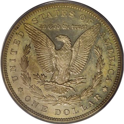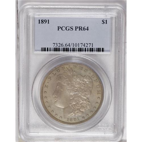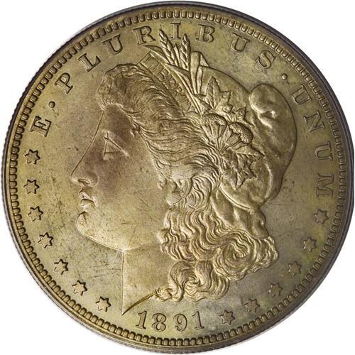 <B>1891<img border='0' src='http://www.heritagecoins.com/images/star.gif' width=10 height=10>$1> PR64 PCGS.</B></I> Grayish-gold and amber-tinged surfaces on each side are lustrous, with few mentionable distractions save for a single straight-line contact mark through the earlobe and lower curls of Liberty. The strike through the center is a bit on the soft side. An appealing and affordable near-Gem. Population: 45 in 64, 44 finer (8/06).