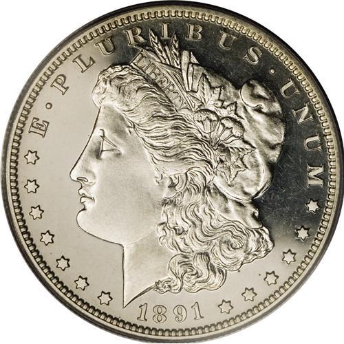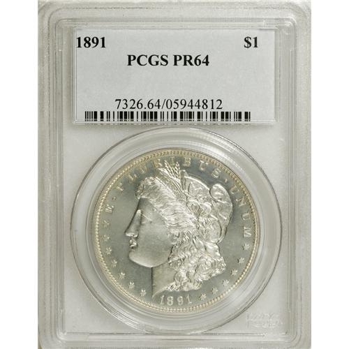 <B>1891 S$1 PR64 PCGS.</B></I> PCGS and NGC have certified roughly 300 or so 1891 proof Morgan dollars, having a mintage of 650 pieces. David Bowers (2005) writes of this issue: "Striking can be weak at the centers. Medium cameo contrast. Low mintage, the possibility of a weak strike, and so many cleaned and dipped coins on the market add up to a challenge." This untoned Near-Gem exhibits a relatively strong field-device contrast, and has been subject to a well executed strike. The only apparent softness occurs in the hair over Liberty's ear. It takes strong magnification to pick out the few faint handling marks.<BR><BR><b>Shipping:</b> Coins & Currency (<a target="_blank" href="http://www.heritageauctions.com/common/shipping.php">view shipping information</a>)
