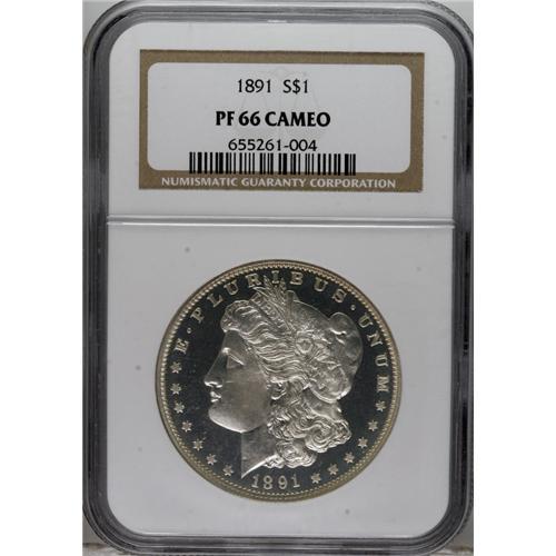 <B>1891 S$1 PR66 Cameo NGC.</B></I> This is a sensational example with fully lustrous and frosty devices on both sides, offset by the deeply mirrored fields. Just a trace of lovely, pale gold rim toning can be seen on each side. Otherwise, the surfaces are essentially brilliant. Both sides have sharp central details. Census: 10 in 66 Cameo, 13 finer (4/07).<BR><BR><b>Shipping:</b> Coins & Currency (<a target="_blank" href="http://www.heritageauctions.com/common/shipping.php">view shipping information</a>)