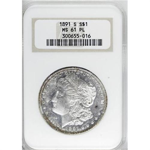 <B>1891-S $1 MS61 Prooflike NGC.</B></I> NGC Census: (6/283). PCGS Population (23/314). Numismedia Wsl. Price for NGC/PCGS coin in MS61: $62. (#7211)<BR><I>From The Diamond Head Collection.</B></I><BR><BR><B>Coin Engraver:</B> George T. Morgan<BR><BR><b>Shipping:</b> Coins & Currency (<a target="_blank" href="http://www.heritageauctions.com/common/shipping.php">view shipping information</a>\)