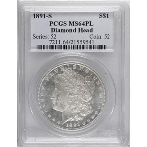 <B>1891-S $1 MS64 Prooflike PCGS.</B></I> PCGS Population (82/19). NGC Census: (103/14). Numismedia Wsl. Price for NGC/PCGS coin in MS64: $300. (#7211)<BR><I>From The Diamond Head Collection.</B></I><BR><BR><B>Coin Engraver:</B> George T. Morgan<BR><BR><b>Shipping:</b> Coins & Currency (<a target="_blank" href="http://www.heritageauctions.com/common/shipping.php">view shipping information</a>\)