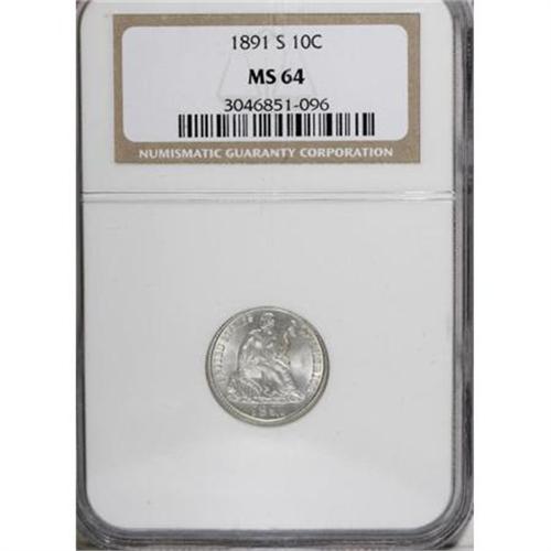 <B>1891-S 10C MS64 NGC.</B></I> This final-year near-Gem shows pleasing overall detail, though Liberty's head and the mintmark show a measure of softness. The minimally toned obverse has vibrant luster, while delicate rose-gold tints drape the reverse. Census: 41 in 64, 35 finer (10/07).<BR><BR><B>Coin Engraver:</B> Christian Gobrecht<BR><BR><b>Shipping:</b> Coins & Currency (<a target="_blank" href="http://www.heritageauctions.com/common/shipping.php">view shipping information</a>)