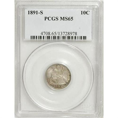 <B>1891-S 10C MS65 PCGS.</B></I> With under 3.2 million pieces produced, San Francisco minted the fewest dimes for any issue of 1891. This pleasingly detailed, richly toned Gem offers strong luster beneath deep, dappled violet, gold, and tan patina.<BR><BR><B>Coin Engraver:</B> Christian Gobrecht<BR><BR><b>Shipping:</b> Coins & Currency (<a target="_blank" href="http://www.heritageauctions.com/common/shipping.php">view shipping information</a>)