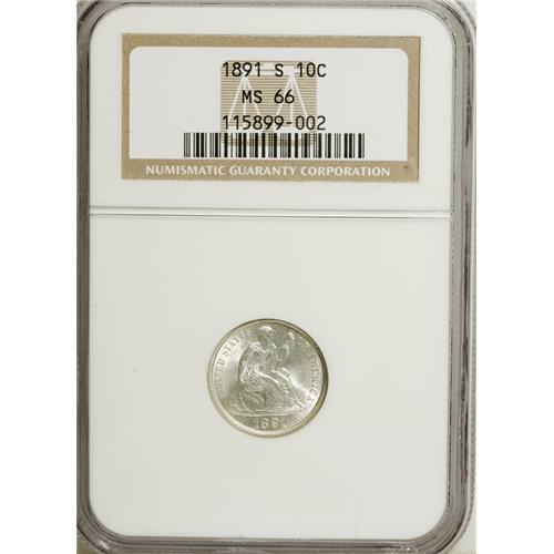 <B>1891-S 10C MS66 NGC.</B></I> Slightly weak on Liberty's hair, but otherwise well impressed. This is an effulgent Premium Gem with untoned snow-white surfaces and dazzling cartwheel luster on each side. Surface marks are practically nonexistent. This was the final year of the long-lived Seated Liberty series. Census: 7 in 66, 5 finer (4/07).<BR><BR><b>Shipping:</b> Coins & Currency (<a target="_blank" href="http://www.heritageauctions.com/common/shipping.php">view shipping information</a>)