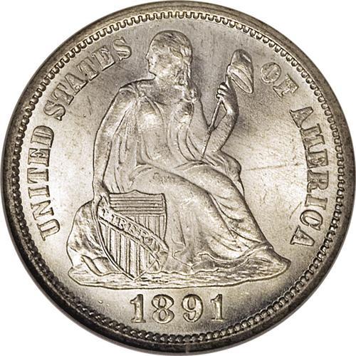 <B>1891-S<10C> MS67 NGC.</B></I> Small S. This frosty dime is virtually untoned, with only the slightest hint of golden color visible at certain angles. The mintmark and Liberty's hair are slightly soft, but the strike is otherwise intricate. As expected of the exceptional grade, there are no mentionable marks, spots, or other distractions. High grade survivors of this final-year Seated Liberty issue are infrequently offered, so the appearance of a Superb Gem example is most unusual. Census: 4 in 67, 1 finer (8/06).