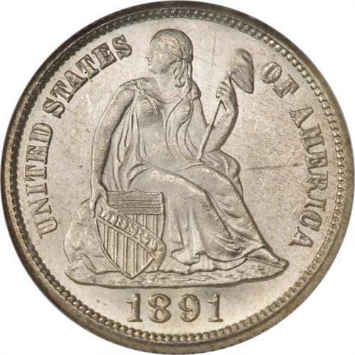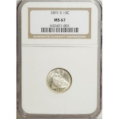 <B>1891-S 10C MS67 NGC.</B></I> Small S. This is a flashy Superb Gem example from the final year of the long-lived Seated Liberty dime series. The mintmark and Liberty's hair are slightly soft, but the strike is otherwise impressive. Radiantly bright and frosty, with essentially untoned brilliant-white surfaces that show just a bit of pale golden color on the obverse. The piece seems impeccably preserved and virtually blemish-free. Census: 4 in 67, 1 finer (6/07). <BR><BR><B>Coin Engraver:</B> Christian Gobrecht<BR><BR><b>Shipping:</b> Coins & Currency (<a target="_blank" href="http://www.heritageauctions.com/common/shipping.php">view shipping information</a>\)