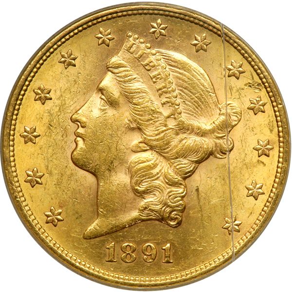 1891-S $20 Liberty. SEGS graded MS-61. We note some obverse marks and our grade of AU-55 is more correct.