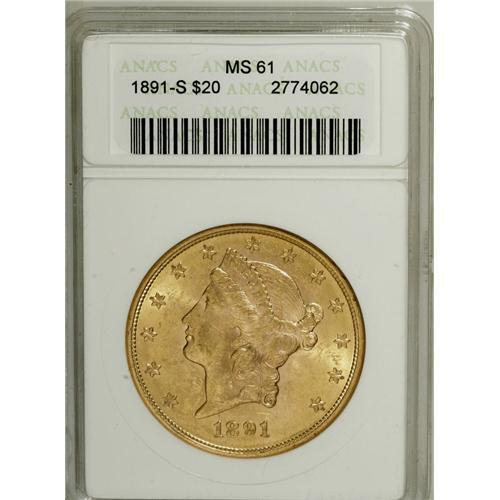 <B>1891-S $20 MS61 ANACS.</B></I> NGC Census: (1539/1896). PCGS Population (689/1983). Mintage: 1,288,125. Numismedia Wsl. Price for NGC/PCGS coin in MS61: $740. (#9018)<BR><BR><b>Shipping:</b> Coins & Currency (<a target="_blank" href="http://www.heritageauctions.com/common/shipping.php">view shipping information</a>)