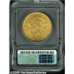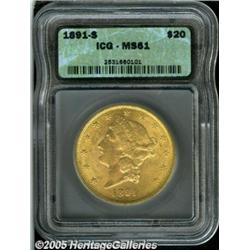 <B>1891-S $20 MS61 ICG.</B></I> Peach and lime overtones grace this shimmering example. Sharply struck, the reverse is quite attractive, and the left obverse is not unduly marked. A tiny spot is noted on Liberty's forehead.