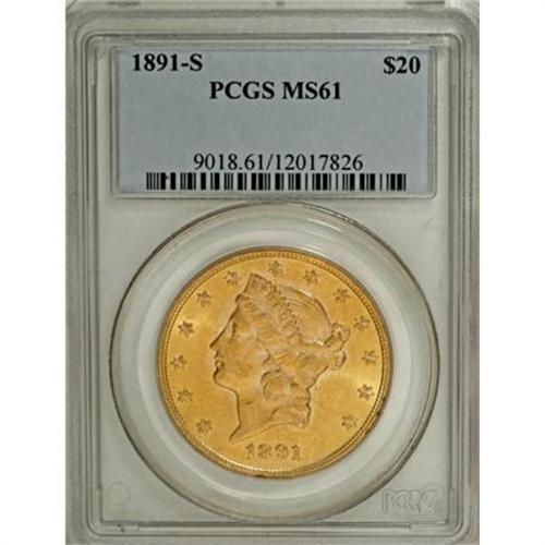 <B>1891-S $20 MS61 PCGS.</B></I> The yellow-orange surfaces show powerful, flashy luster. Scattered light to moderate abrasions preclude a finer designation, yet the coin remains solid eye appeal.<BR><I>From The York/Hallenbeck #2 Current Finest PCGS Registry Set of Liberty Double Eagles.</B></I><BR><BR><B>Coin Engraver:</B> James B. Longacre<BR><BR><b>Shipping:</b> Coins & Currency (<a target="_blank" href="http://www.heritageauctions.com/common/shipping.php">view shipping information</a>)
