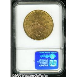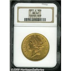 <B>1891-S $20 MS62 NGC.</B></I> The design elements are sharply struck, and peach-gold surfaces display subtle greenish undertones. Grade-limiting marks are visible on Liberty's cheek and neck and in the left obverse field.