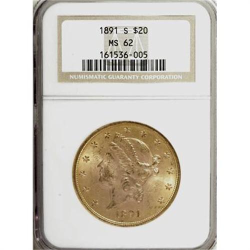 <B>1891-S $20 MS62 NGC.</B></I> NGC Census: (1523/428). PCGS Population (1434/678). Mintage: 1,288,125. Numismedia Wsl. Price for NGC/PCGS coin in MS62: $945. (#9018)<BR><BR><B>Coin Engraver:</B> James B. Longacre<BR><BR><b>Shipping:</b> Coins & Currency (<a target="_blank" href="http://www.heritageauctions.com/common/shipping.php">view shipping information</a>)