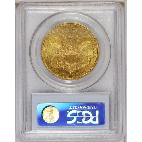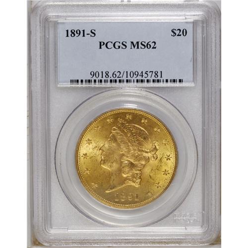 <B>1891-S $20 MS62 PCGS.</B></I> A highly lustrous and suitably impressed yellow-orange representative. Each side has light to moderate abrasions, and a copper stain appears below the ES of STATES.<BR><BR><b>Shipping:</b> Coin/Currency (<a target="_blank" href="http://www.heritageauctions.com/common/shipping.php">view shipping information</a>)